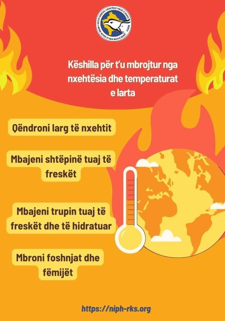 Temperaturat e larta që mbretërojnë gjatë periudhës së verës ndikojnë negativisht në shëndetin e njeriut e sidomos te grupet e ndjeshme të popullatës siç janë fëmijët e vegjël, gratë shtatzëna, të sëmurët kronik, të moshuarit dhe punëtorët. Këtij rreziku i nënshtrohen edhe personat që punojnë në mjedise të hapura si bujqësi, pylltari, ndërtimtari, pastrim dhe […]