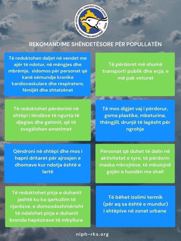 Këto ditë Kosova dhe veçmas qyteti i Prishtinës po përballet me nivele të larta të ndotjes së ajrit. Ndotja e ajrit konsiderohet një rrezik për shëndetin e njeriut, e sidomos për grupet e ndjeshme dhe me sëmundje të rrugëve dhe organeve të frymëmarrjes. Efektet shëndetësore afatshkurtra të ndotjes së ajrit në shëndet: sëmundjet, shtrimet në […]